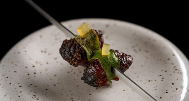 Galinha e porco tomam as bases da sequência do menu. Da galinha, a ostra de frango com molho ácido de cenoura e sorbet de milho verde que traz frescor e conforto em uma etapa provocativa; acompanhando, sambiquira na brasa, em um formato que traz técnicas de yakitori – espetinho oriental. O trabalho com a carne suína é aberto com o potente ravióli de porco, com caldo de pé, aproveitando, assim, o máximo que o animal tem a oferecer.
